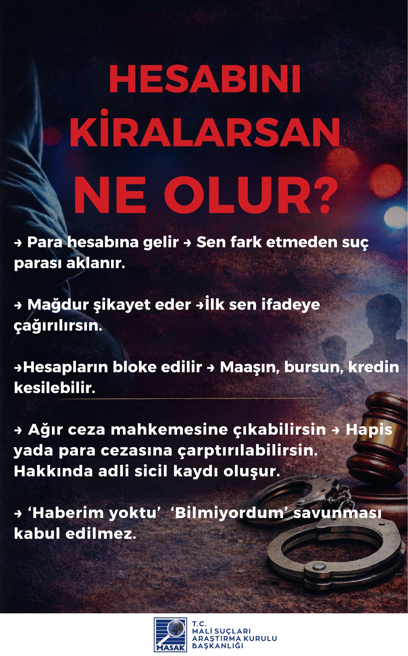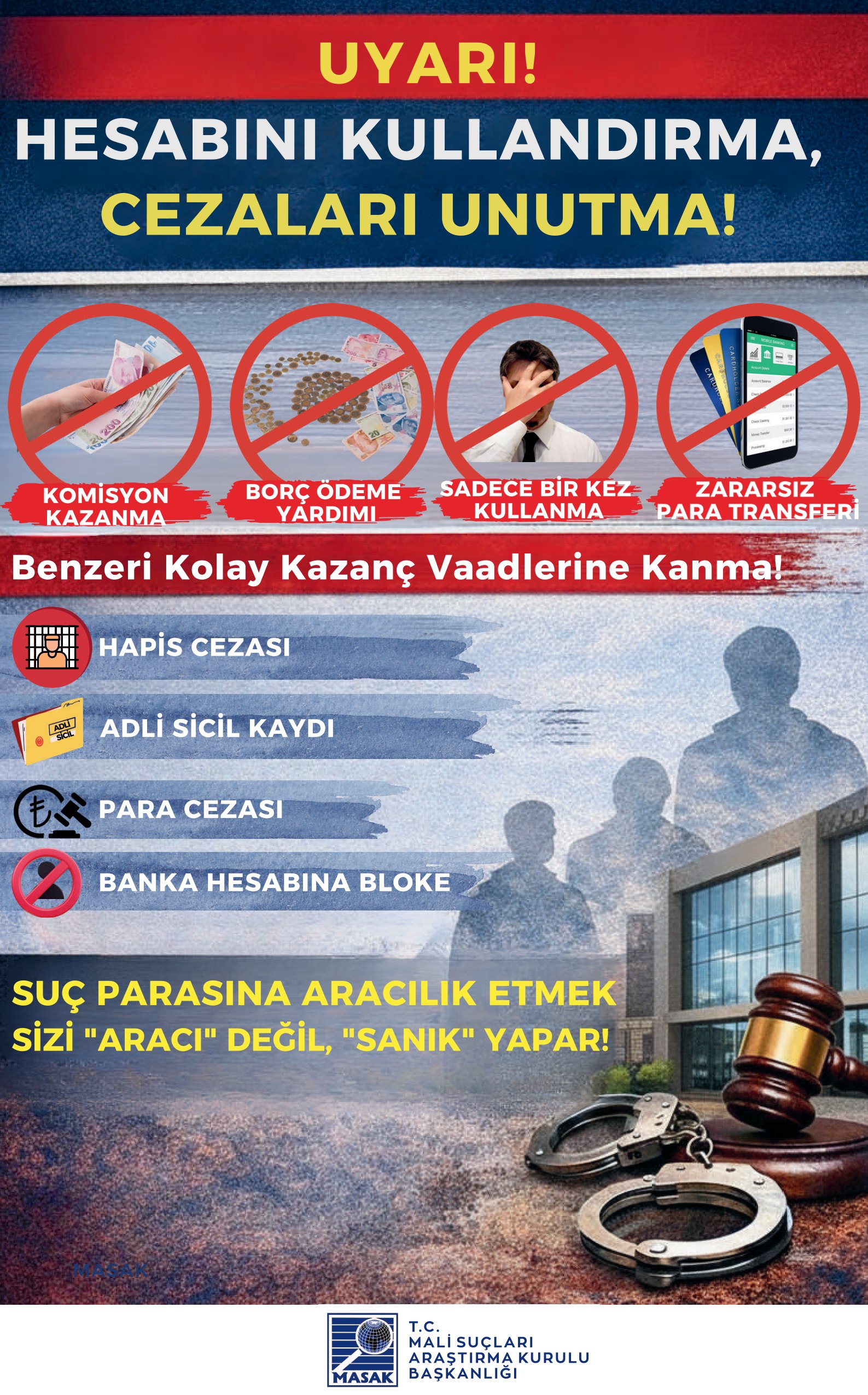 Tanıdığınız ya da tanımadığınız kişilerden gelen, hesap veya IBAN paylaşımı karşılığında kazanç vaadi içeren her türlü teklifi reddetmeniz ve şüpheli durumları derhâl güvenlik yetkililerine bildirmeniz önem arz etmektedir.